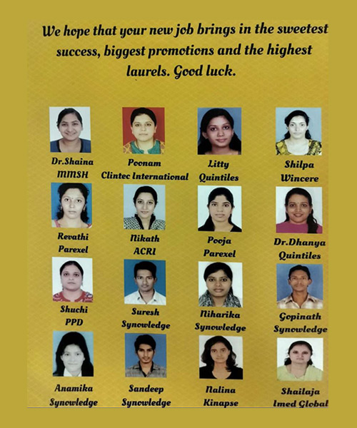 Our commitment to our students does not just end with providing them the best skills and training possible, but also to helping them start their career with the best names in the industry. No wonder, we have the best placement record for Clinical Research professionals and our previous batch students are placed with top CROs, Pharmaceuticals and Bio-tech companies. This has helped ACRI earn the reputation of being the best clinical research institute in Bangalore for those looking to build long-term careers in this expanding field. Our alumni success is a reflection of our dedication to academic precision and industry relevance.